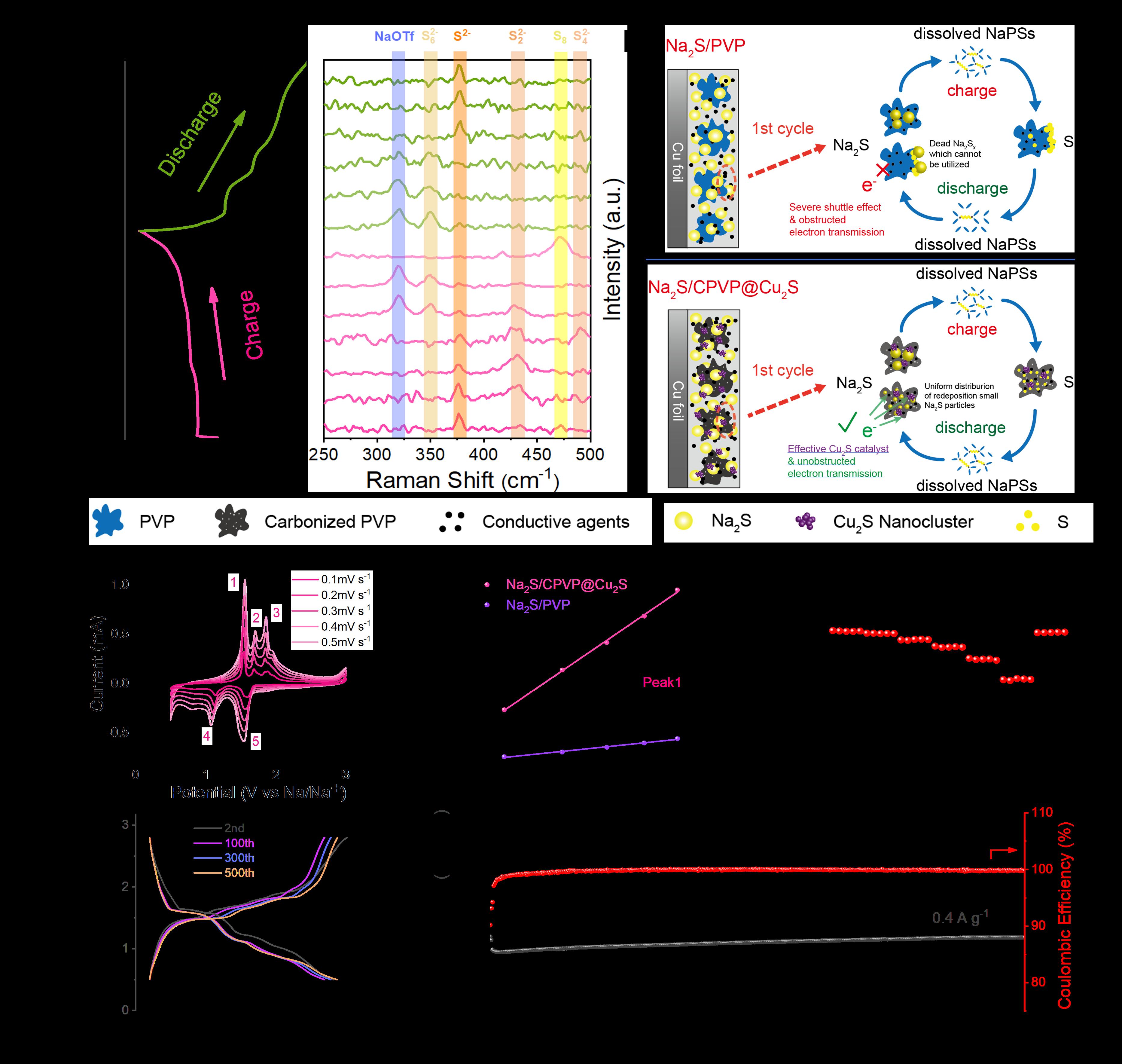 室温钠硫(RT Na-S)电池以低成本、无毒、储量丰富的钠和硫为活性材料,具有极高的能量密度(1274 Wh kg-1),在储能系统中具有广阔的应用前景。硫化钠(Na2S)是室温钠硫电池无钠阳极体系下最有前途的初始正极材料,然而其电子导电性差、传递动力学慢等问题限制其应用,因此需要开发纳米结构Na2S@C材料。近日,我院许晶晶研究员与中国科学院苏州纳米所吴晓东研究员合作:通过调节硫化钠的再沉积行为,巧妙地设计了一个有前途的Na2S/CPVP@Cu2S一体化阴极。热处理高温促进聚乙烯吡咯烷酮(PVP)碳化成包裹硫化钠颗粒的连续导电基体,铜集流体表面的氧化层与硫化钠发生原位反应,生成硫化亚铜催化剂。得益于一体化阴极的协同作用,微米级硫化钠颗粒在初始循环过程中通过固-液-固转化迅速自细化为纳米级硫化钠颗粒,且在后续循环过程中尺寸保持稳定。由于快速的转化动力学有效地抑制了穿梭效应,所制备的Na2S/CPVP@Cu2S表现出优异的循环稳定性和倍率性能。本工作实现了源自工业废弃物的硫化钠的稳定循环,为室温钠硫电池无钠阳极体系的研究和实际应用提供了重要参考。